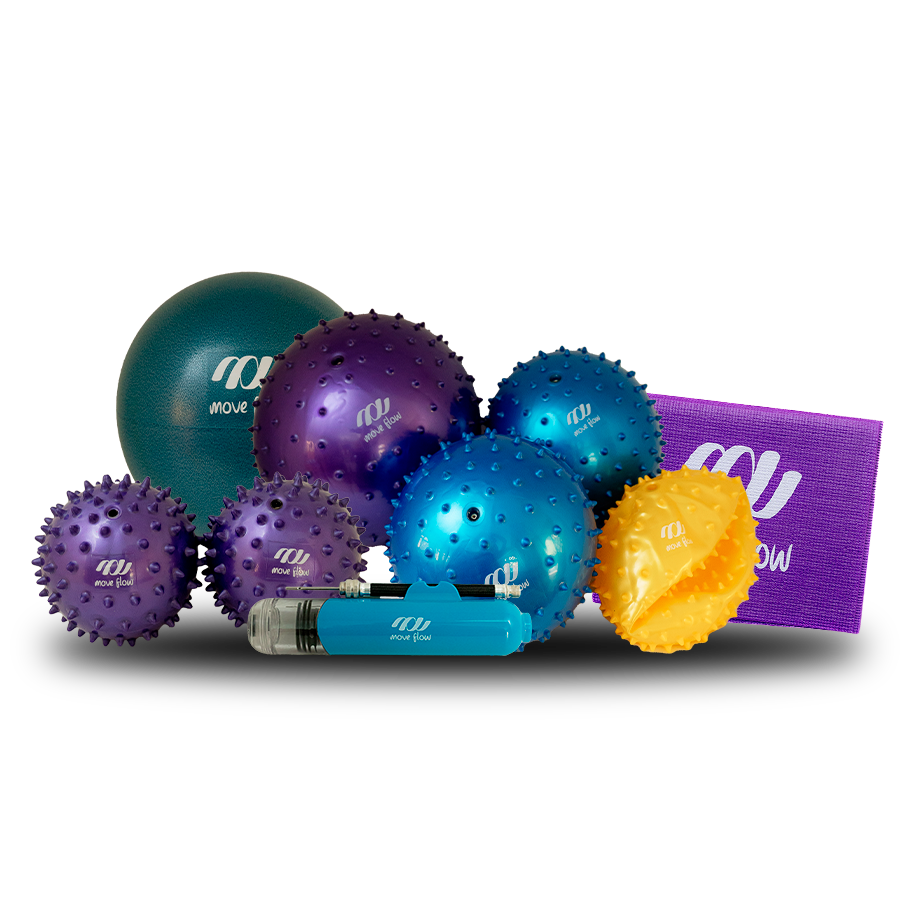 Além das bolinhas texturizadas, o Move Flow tem acessórios complementares como os pesinhos de 0,5kg que aumentam a percepção das extremidades, a bomba de encher para as bolinhas do método, o colchonete dobrável oficial do Move Flow e o kit de fragrâncias para proporcionar um ambiente sensorial completo.